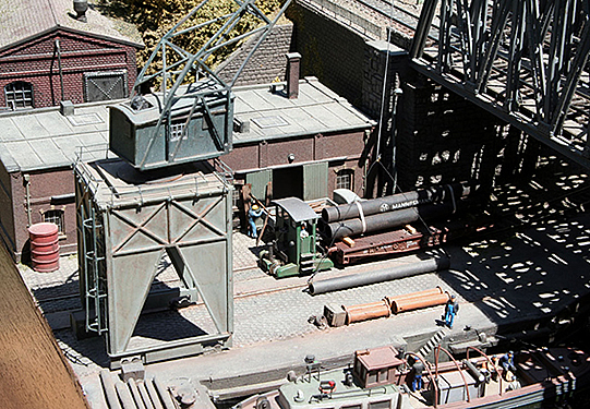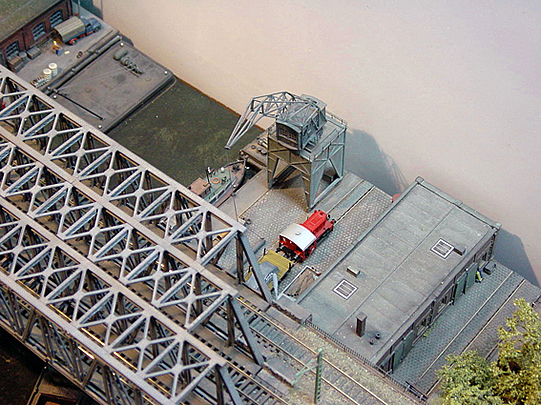 Die dreigleisige Kastenbrücke entstand aus nicht weniger als 6 Bausätzen von Vollmer. Die einzelnen Brückenelemente wurden gegenüber dem Originalbausatz um etwa die Hälfte verlängert (ohne statischen Nachweis ...) und unter Weglassen von 2 Brückenseitenteilen zu dem - entsprechend dem Hafenbecken versetzten - 3-gleisigen Gesamtgebilde vereinigt. Die Lackierung mit Airbrush übernahm freundlicherweise Manfred Baaske - der auch für die Erzlieferung für das unter der Brücke liegende Binnenschiff (Artitec) sorgte.